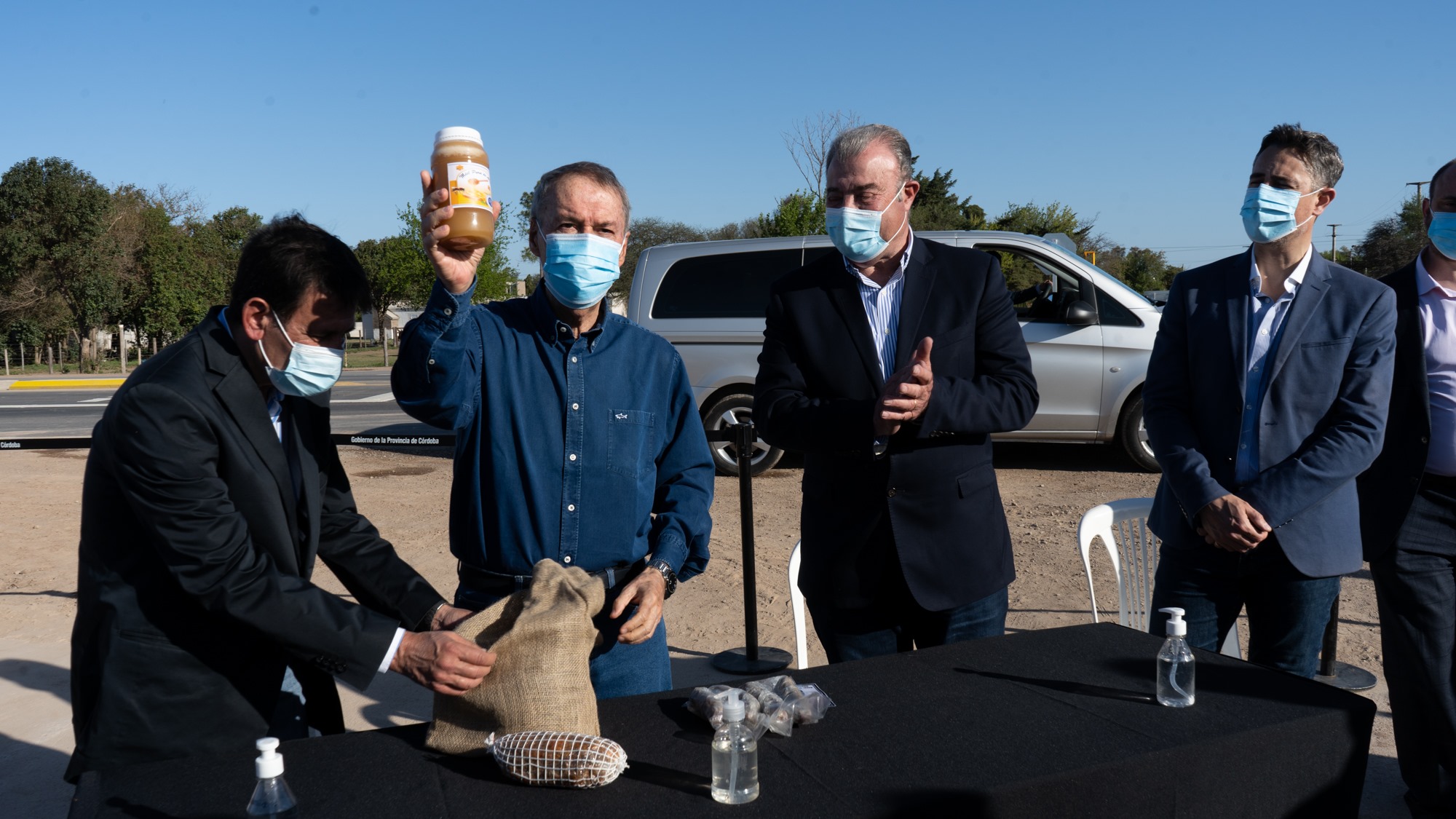 Antes del cierre del acto, desde el Instituto Manuel Belgrano le hicieron entrega al Gobernador de productos regionales elaborados en la sección Sección Agrotécnica de la Institución: salames y miel pura de abejas.