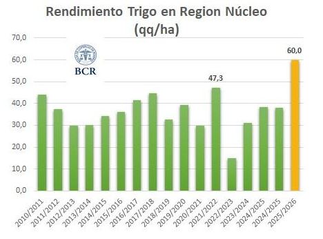 Después de varias semanas de lluvias recurrentes, llegó el buen tiempo. Las labores de recolección de trigo se desplegaron y avanzaron rápidamente hasta cubrir el 40% del áreaLa cosecha progresa sobre todo en el centro-sur santafesino y en el sureste cordobés; hacia el extremo sur santafesino y norte bonaerense apenas está arrancando. La trilla ha sido la gran noticia porque no solo confirmó las altas expectativas, si no que fueron superadas. La campaña se salió de toda lógica: “los rindes son excepcionales, nunca vistos, completamente por fuera de las estadísticas históricas”. Con este avance, el promedio de la región es de 60 qq/ha, cuando el máximo valor histórico del trigo era de 47,3 qq/ha.