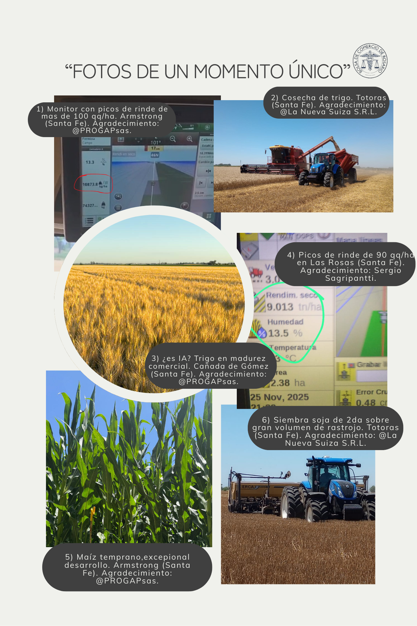 En la imagen del medio, un lote de trigo a punto de cosecharse en Cañada de Gómez mostró tal nivel de desarrollo que parece una foto generada con inteligencia artificial, pero el lote es real y la expectativa es que supere los 70 qq/ha. En Totoras, la foto de la cosecha del trigo y, luego, la de la siembra de soja de segunda. Otra cosa que no se suele ver y es otra postal destacable de este inédito ciclo triguero es el gran volumen de rastrojo tras la cosecha. Este rastrojo que va a proteger al suelo, conservando la humedad, evitando la erosión y nutriéndolo con el aporte de materia orgánica, tiene un inconveniente: ¿cómo se hace para sembrar encima la soja de 2da? En la zona los ingenieros explican: “tenés que empezar a sembrar a media mañana. De lo contrario, se entierra el rastrojo, ya que no lo corta bien la máquina por la humedad”. En las últimas fotos aparecen los maíces tempranos de Armstrong. Cabe destacar algo que hace muchos años no se veía en noviembre en la región centralun maíz tan bien desarrollado y con una estructura de planta que soprende a muchos técnicos. Desde Aldao dicen: “Está floreciendo con barro en los surcos, creció sin sufrir nungún momento de escasez”.