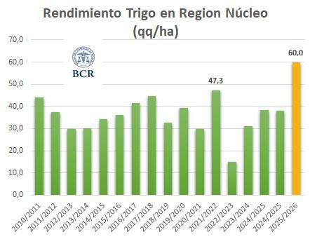 “Los rendimientos son históricos, nunca vistos en la zona”, señalan en Marcos Juárez. Con un avance del 65% de la cosecha, el promedio están en torno a los 70 qq/ha con picos de 95 qq/ha y mínimos de casi 40 qq/ha. En Carlos Pellegrini, con un 60% cosechado, los rindes van de 40 a 75 qq/ha. En Amstrong, Cañada de Gómez y Totoras, los resultados se ubican entre 60 y 80 qq/ha con lotes de inferior calidad o  afectados por roya del tallo que arrojan 55 qq/ha y “picos explosivos” que tocan los 100 qq/ha. En Fuentes, General Lagos y alrededores de Rosario van de 55 a 60 qq/ha con un avance del 30%. Solo en el noroeste bonaerense se mencionan valores más magros, pero allí apenas está cosechado el 3% del área y, además, corresponden a lotes de menor calidad, con promedios de 40 a 50 qq/ha. En la zona esperan que los rindes repunten cuando la cosecha se generalice después de las lluvias previstas para este fin de semana, ya que aún hay bastante grano verde.