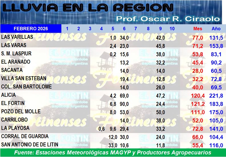 Inicio Campo Lluvia caída en toda la región Campo Lluvia caída en toda la región febrero 9, 2026 4 FacebookTwitterPinterestWhatsApp Últimas noticias Multitudinario público en el Festival Alicia en el Lago febrero 9, 2026 Arrasa como Topadora en el Festival Alicia en el Lago febrero 9, 2026 Arturo Bienedell, vocal de la Agencia Córdoba Cultura, estuvo presente en el Festival Alicia en... febrero 9, 2026