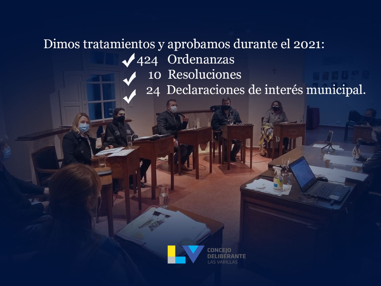 Durante el año 2021 en el Concejo Deliberante desarrolló una importante actividad legislativa. En 41 sesiones ordinarias, 1 sesión extraordinaria y 37 reuniones de comisión, los concejales de los bloques Todos Juntos Por Las Varillas y Hacemos por Córdoba analizaron, dieron tratamiento y en su gran mayoría buscaron los consensos necesarios para aprobar a lo largo del año más de 450 proyectos entre ordenanzas, resoluciones y declaraciones de interés municipal.Además, se concretaron más de 30 audiencias públicas, instancias abiertas de debate para que vecinos e instituciones del medio puedan expresar sus opiniones sobre los diferentes proyectos a tratar, tal es el caso de las obras por contribución de mejoras (gas natural, pavimentos, cordón cuneta, etc) o por los proyectos de Presupuestos y Tarifarias 2022. En estas jornadas se contó con la participación de los funcionarios del Poder Ejecutivo Municipal que explicaron detalladamente cada uno de los asuntos.