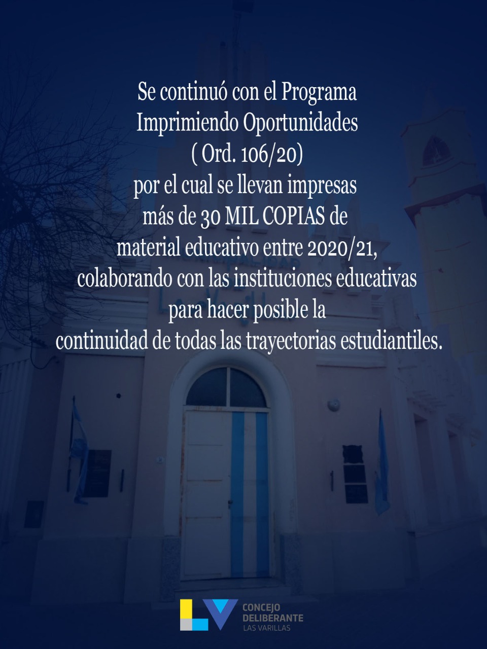 Aprobado por Ord. 106/2020, durante el 2021 se continuó colaborando con las escuelas de nivel medio en la impresión de material educativo para acompañar las trayectorias estudiantiles que requerían de este recurso para avanzar en sus estudios. En total se llevan impresas MÁS DE 30 MIL COPIAS.