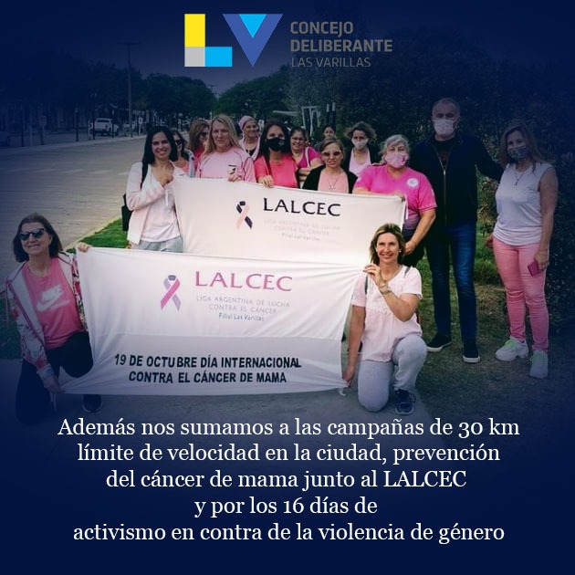 Nos sumamos nuevamente a la Campaña de Prevención del cáncer de Mama que organiza el LALCEC Las Varillas; participamos de la campaña organizada por la Secretaría de Gobierno y Acción Social a través del Dpto de Tránsito y Seguridad Ciudadana “30 Km límite de Velocidad en la Ciudad” y a los 16 Días de Activismo en contra de la Violencia hacia las Mujeres y Niñas.