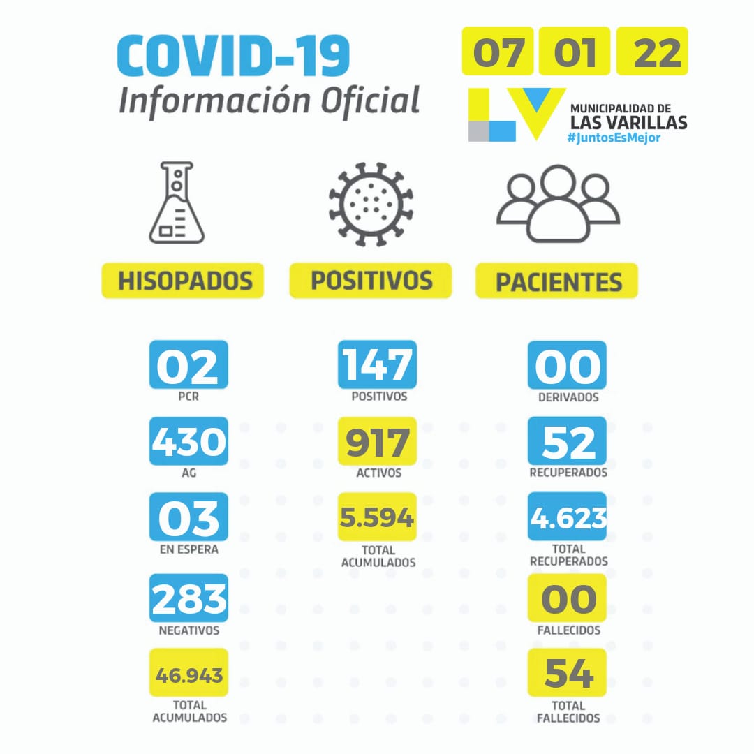 97 casos del reporte oficial del día sábado, que se suman a los 147 del día viernes, lo que arroja un total e 995 casos activos en la ciudad de Las Varillas.