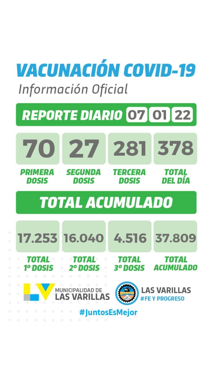 Por otra parte, se aplicaron el día viernes 7 de enero, 70 primeras dosis, 27 segundas dosis y 281 terceras dosis.