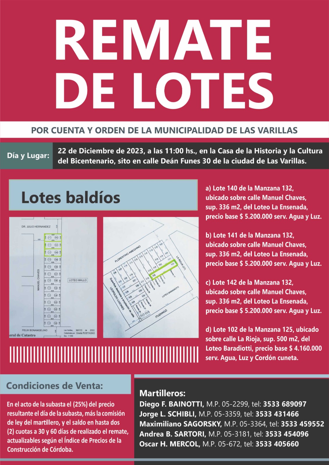 Remate de lotes en Las Varillas
