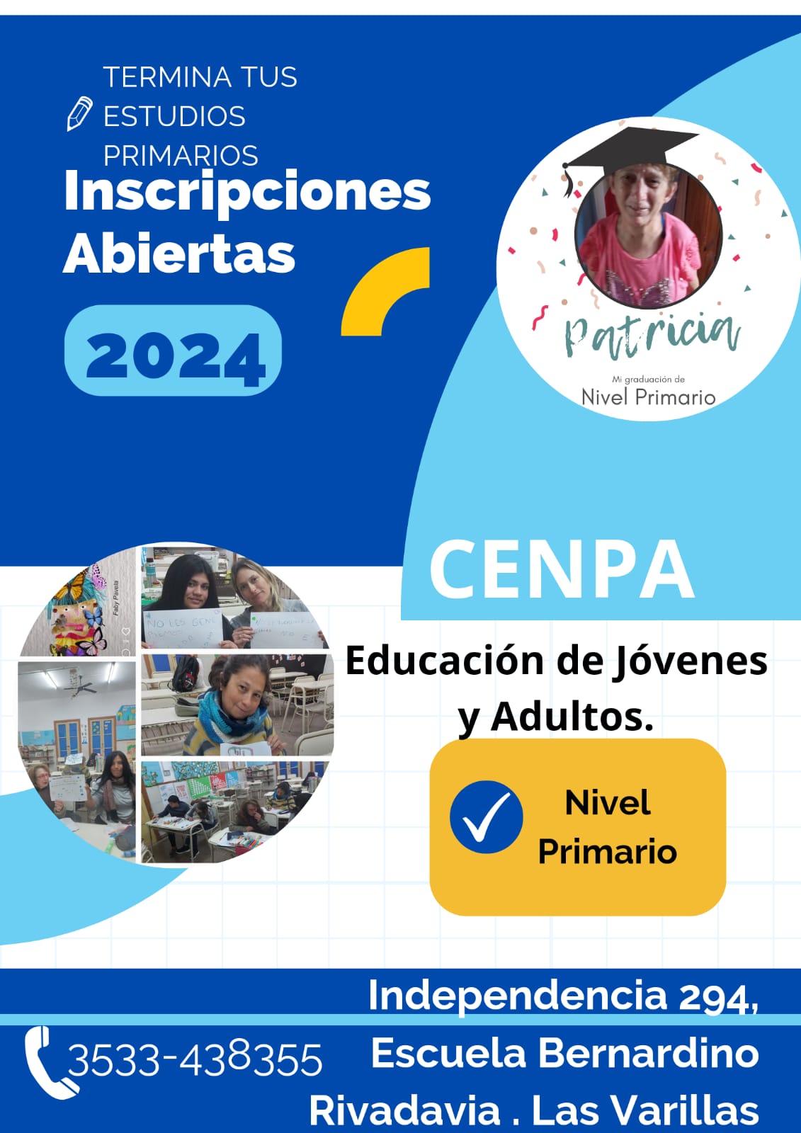El CENPA, Centro Educativo Nivel Primario de Jóvenes y Adultos “Bernardino Rivadavia B”, funciona en la Escuela Bernardino Rivadavia de Las Varillas, en la calle Independencia 294, de Lunes a Viernes a partir de las 18:00hs. También te podés contactar por WhatsApp al 3533438355. Las inscripciones están abiertas todo el año. Los requisitos para inscribirte son: