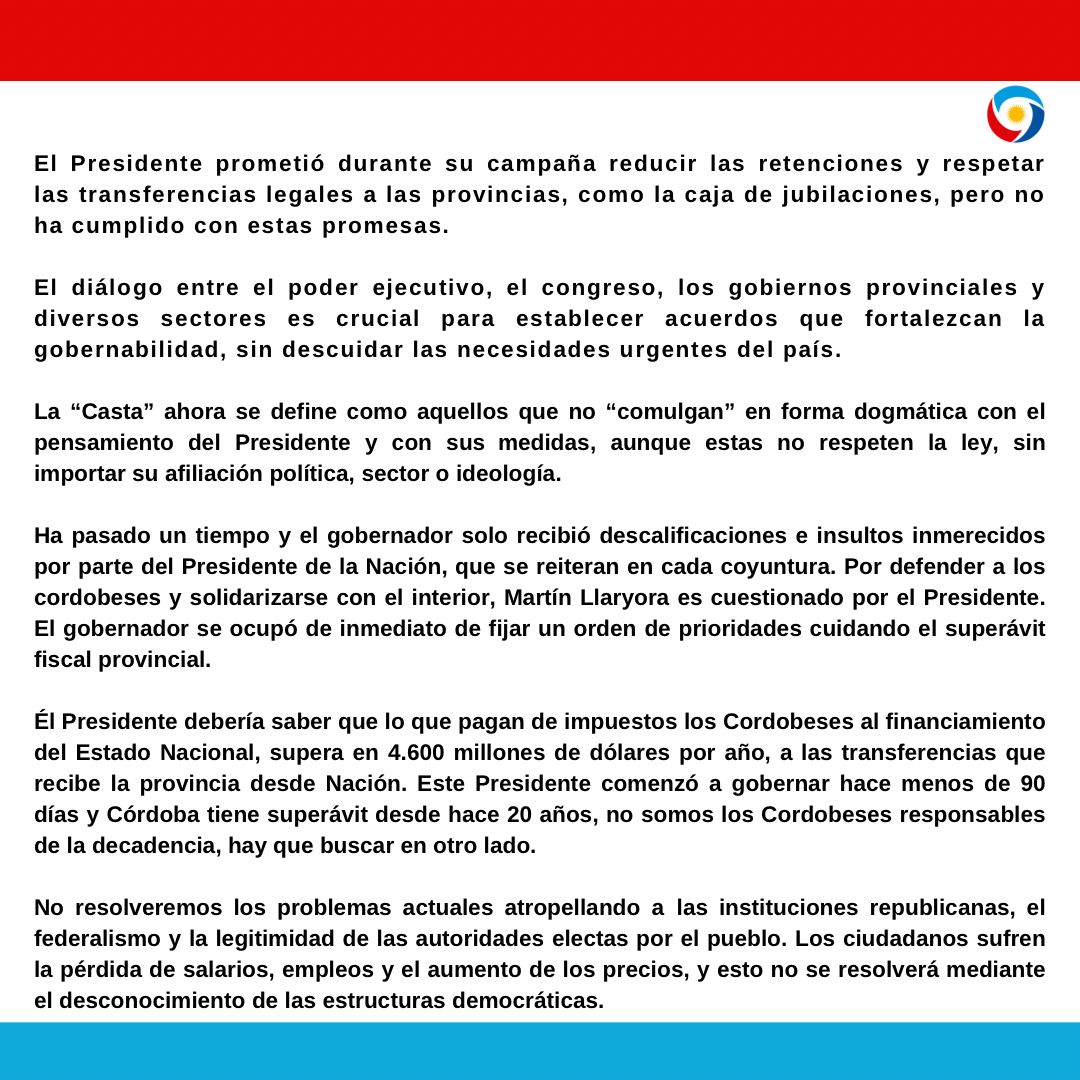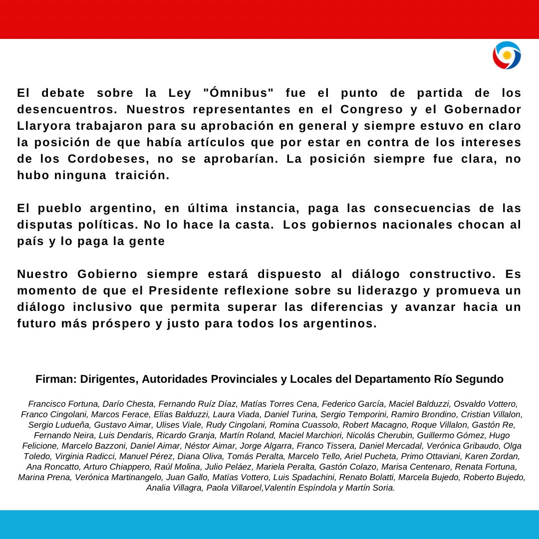 Dirigentes de Hacemos Unidos por Córdoba junto a Autoridades Provinciales y Locales del Departamento Río Segundo emitieron un comunicado en el que se solidarizan con el Gobernador Martín Llaryora a raíz de las expresiones del Presidente Javier Milei.