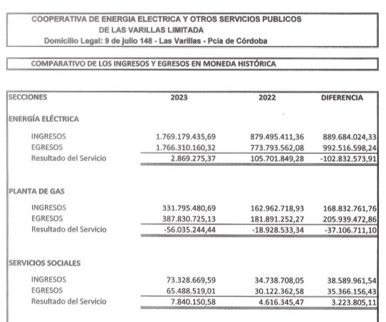 Lo datos más significativos y alarmantes los brindaron los servicios cuyo balance presentan resultados negativos: El servicio de gas licuado que brinda la planta de gas cooperativa tuvo resultado negativo de 113.421.143 (millones de pesos).