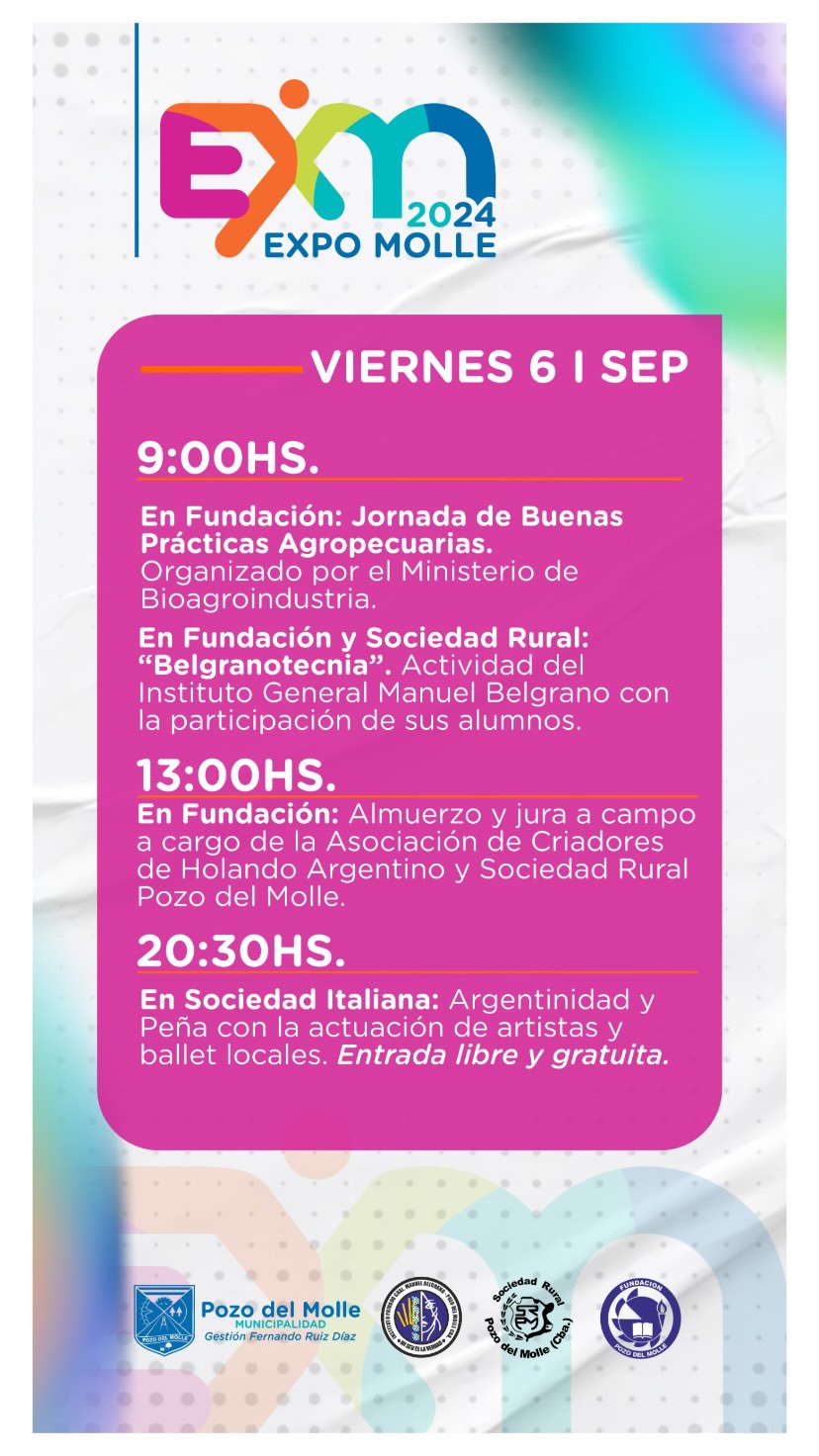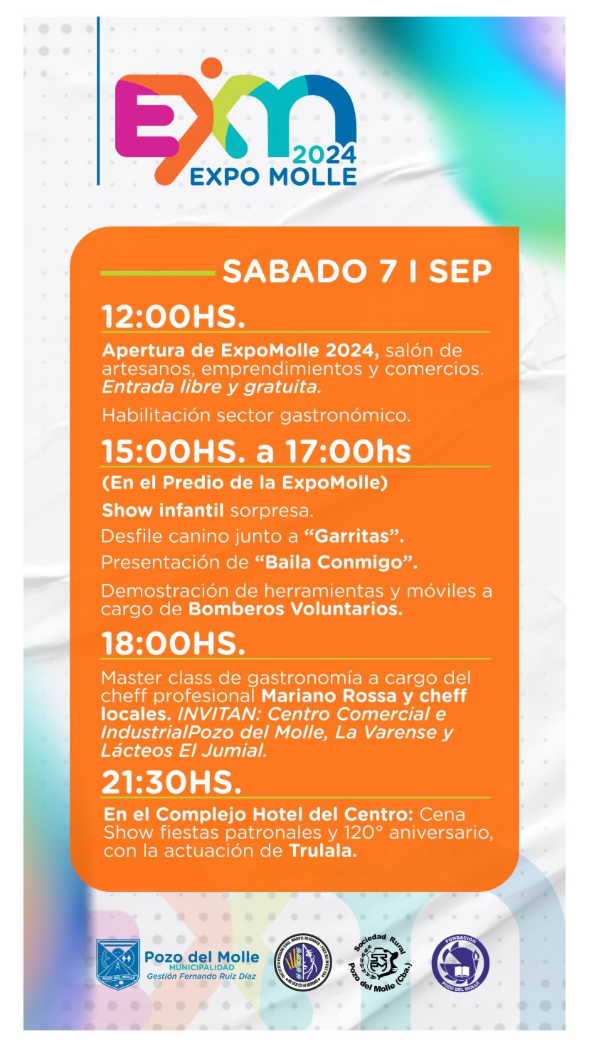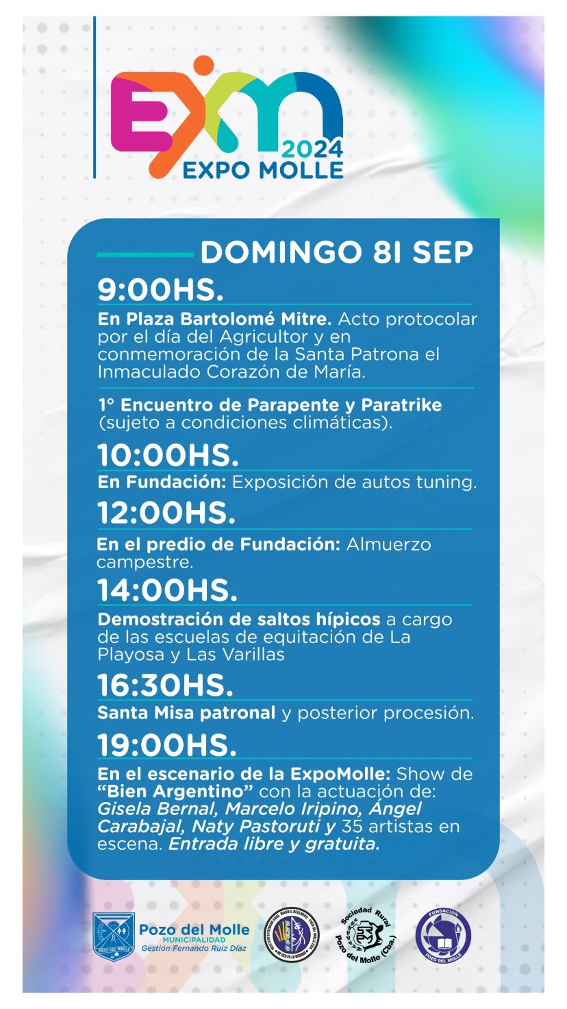 Inicio Destacadas Programa de Festejos Patronales de Pozo del Molle InstitucionalLocalidadesPozo del Molle Programa de Festejos Patronales de Pozo del Molle septiembre 2, 2024 908 FacebookTwitterPinterestWhatsApp Los días 6, 7 y 8 de septiembre Pozo del Molle se viste de fiesta para celebrar su 120º Aniversario. No te pierdas el espectacular programa de Festejos Patronales. Últimas noticias “Fallo ejemplar”: condenaron a un productor por la desaparición de casi 2000 cabezas de ganado abril 28, 2026 Visita de funcionarios y técnicos de la Secretaría de Ambiente a Pozo del Molle abril 28, 2026 Accidentes en Las Varillas abril 28, 2026