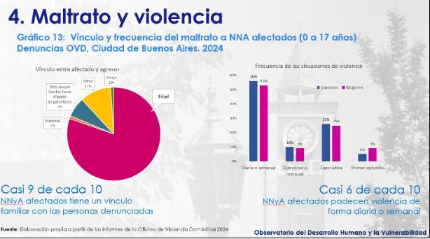 La evidencia más reciente confirma que la violencia contra la infancia sigue siendo un problema estructural. Según datos de la Oficina de Violencia Doméstica (OVD), en 2024 los niños, niñas y adolescentes representaron el 30 % de los afectados en casos de violencia doméstica, con una tendencia creciente en los últimos años. Casi 9 de cada 10 víctimas tenía vínculo familiar con el agresor y 6 de cada 10 padecía violencia diaria o semanal. Las formas más frecuentes fueron la violencia psicológica (más del 90 %) y la física (entre el 34 % y el 39 %), seguidas por violencia simbólica, económica y sexual. El grupo más afectado fue el de 6 a 10 años, mientras que entre los adolescentes de 15 a 17 años se registró el 28 % de las lesiones físicas constatadas.