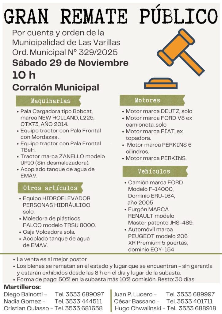 La Municipalidad de Las Varillas, por Ordenanza Municipal N° 329/2025, convoca a un Gran Remate Público que se llevará a cabo el próximo sábado 29 de noviembre a las 10:00 horas en el Corralón Municipal.
