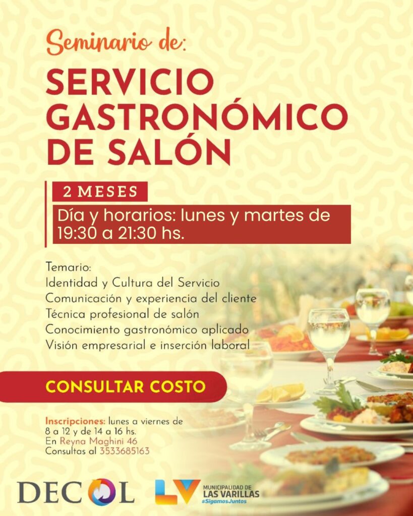 Por otro lado, para quienes buscan especializarse en el rubro gastronómico, se ofrece la capacitación en Servicio Gastronómico de Salón, con una duración de dos meses y clases los lunes y martes de 19:30 a 21:30 horas. Esta formación integral cubre desde la identidad del servicio y la experiencia del cliente hasta técnicas profesionales y visión empresarial para la inserción laboral.