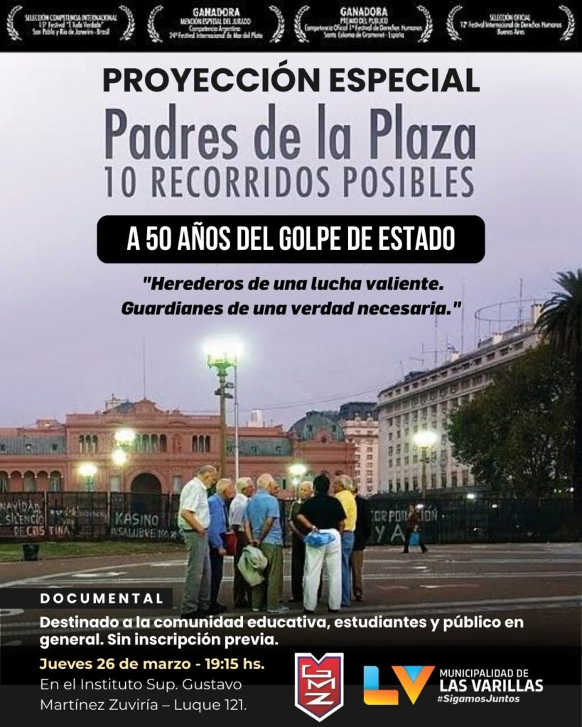 En el marco de la conmemoración de los 50 años del último golpe de Estado, la Municipalidad de Las Varillas invita a toda la comunidad a participar de una proyección especial del aclamado documental «Padres de la Plaza. 10 RECORRIDOS POSIBLES». Este film, que ha recibido numerosos reconocimientos a nivel nacional e internacional, ofrece una mirada profunda y conmovedora sobre la historia reciente de nuestro país.