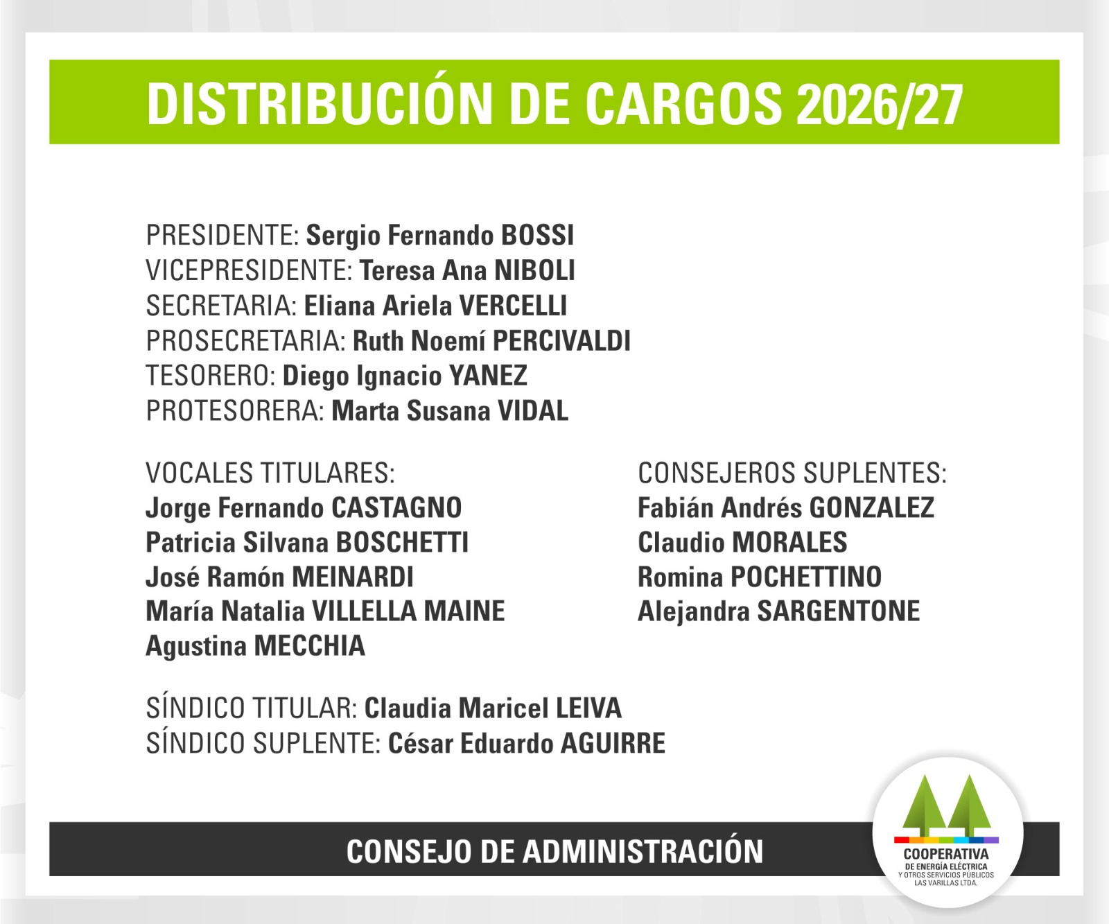 CONSEJO DE ADMINISTRACIÓN – DISTRIBUCIÓN DE CARGOS 2026/27