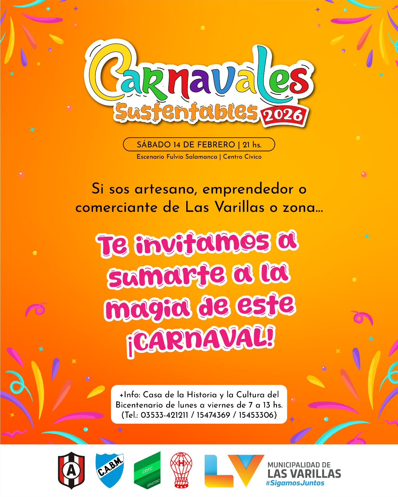 Se recuerda que sigue abierta la invitación para artesanos, emprendedores y comerciantes de Las Varillas y la zona que deseen sumarse a la fiesta de carnaval. Para más información, deben acercarse a la Casa de la Historia y la Cultura del Bicentenario, de lunes a viernes de 7:00 a 13:00 hs., o comunicarse a los teléfonos: 03533-421211 / 15474369 / 15453306.
